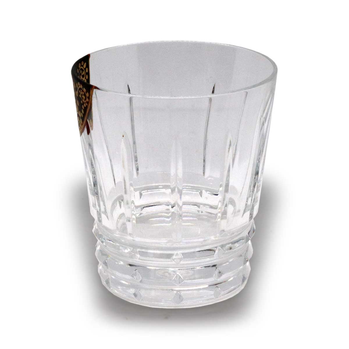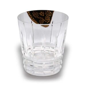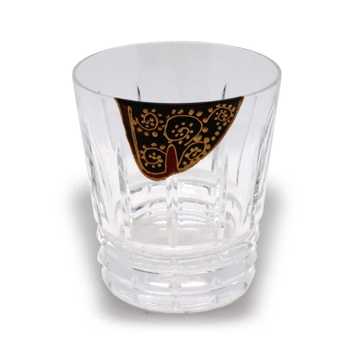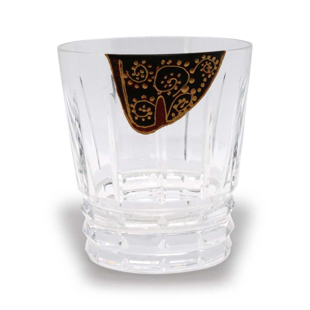 完成したグラスの美しさは、光を浴びて煌めくバカラのクリスタル、その深淵を思わせる漆黒、そして、その上を自在に駆け巡る金の唐草が、見事な調和を見せています。