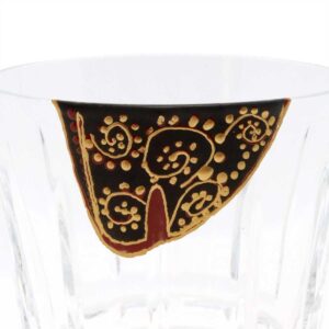 一方、グラスの背面(画像1)には、正面とは異なる、より繊細で細かい唐草文様が描かれています。こちらは、より複雑で奥ゆかしい表情を見せ、上部には金の点描による縁取りが施されています(画像3)。この異なるデザインが1つのグラスに共存することで、どの角度から見ても新しい発見があります。