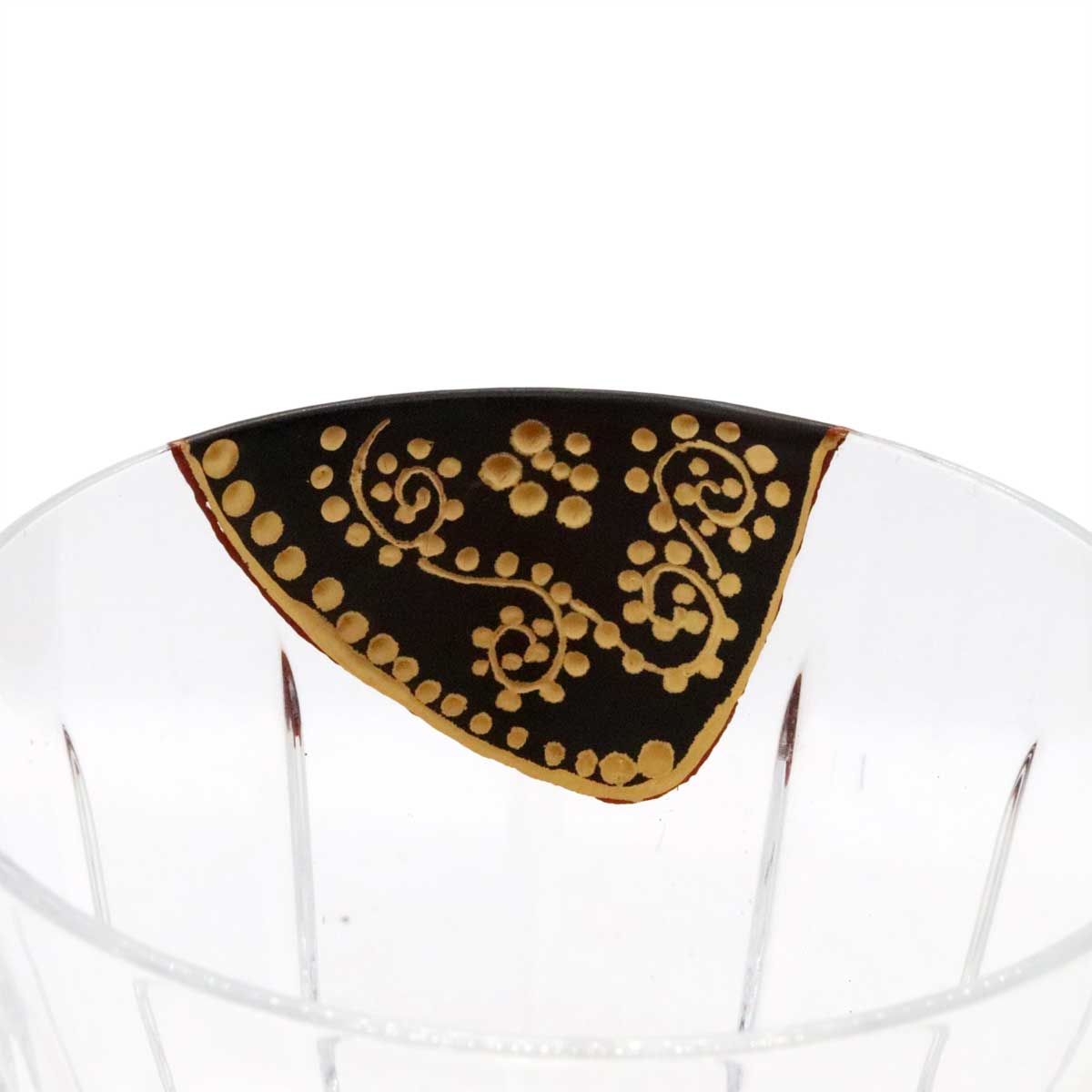 今回ご紹介するのは、割れてしまったバカラのクリスタルグラスを金継ぎで修復し、さらにその継ぎ目に高度な蒔絵(まきえ)を施した例です。