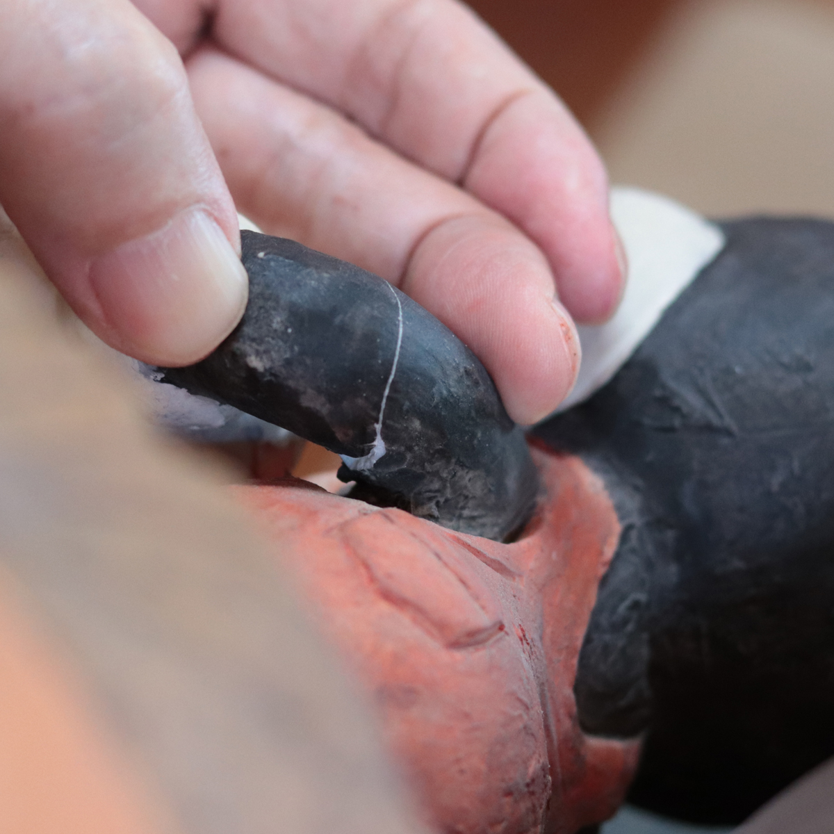 樹脂人形20221014 金継依頼品 2022.10.142026.01.17 Before After Before樹脂で作られた人形で腕の所が折れてしまった所を継いで出来るだけ継いだ所が解らないようにして欲しいとの依頼でした。 After行った作業は樹脂で継いで、継いだ所は炭を混入した黒い樹脂で見た目では解らないよう施しました。