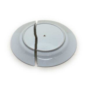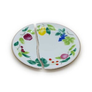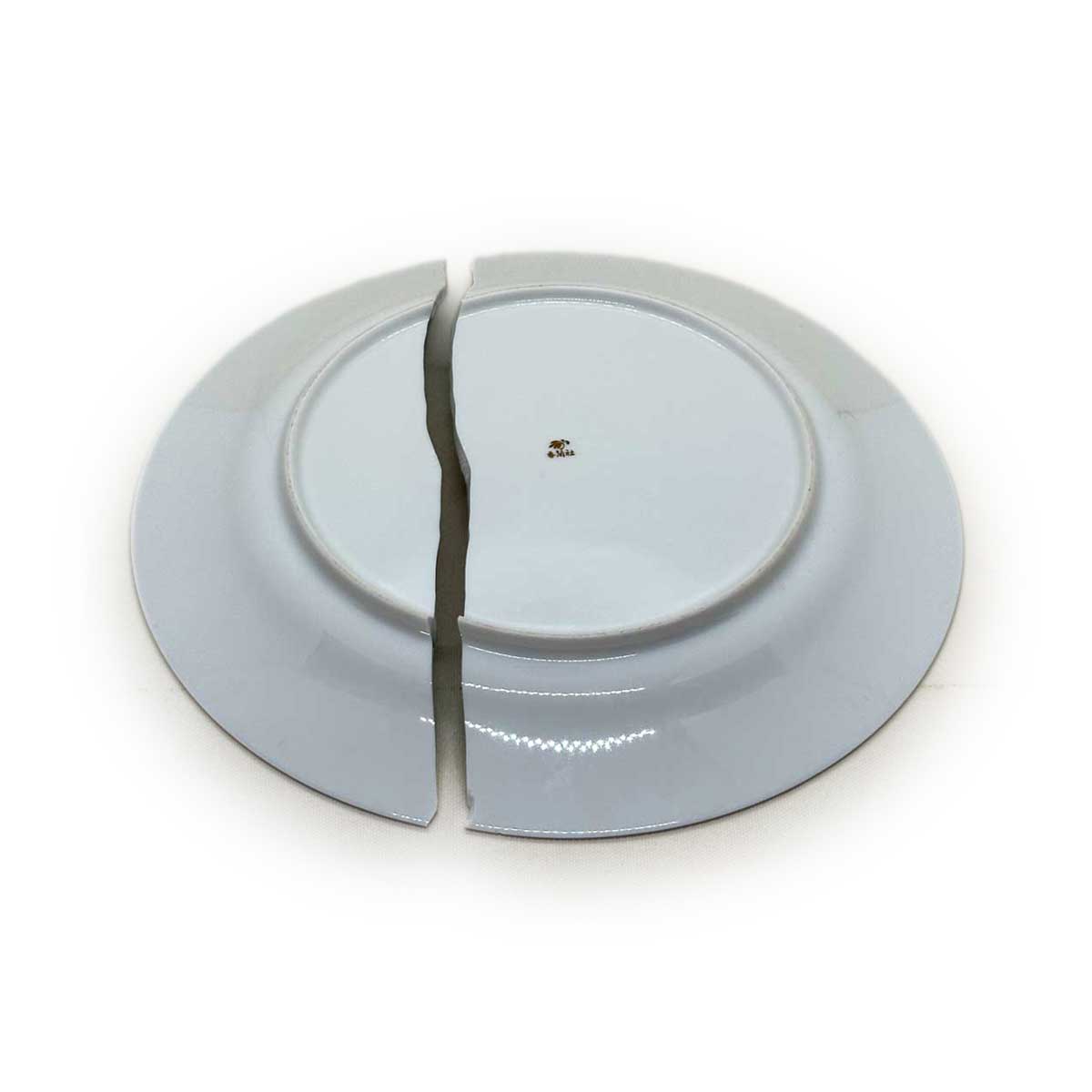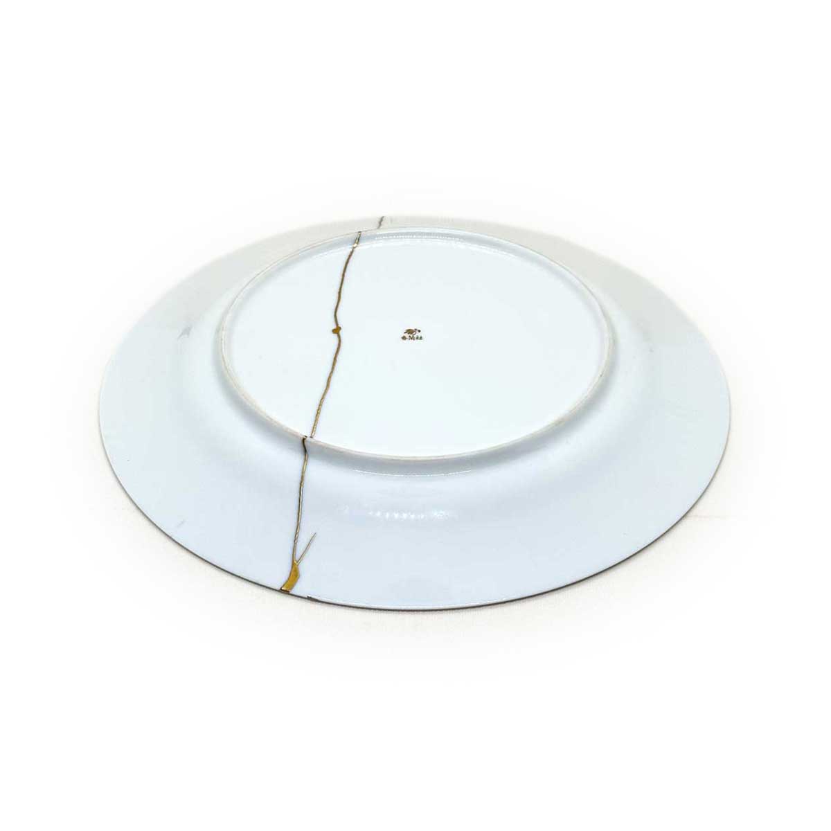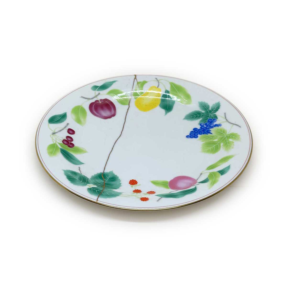 優美な絵付けで知られる香蘭社の洋皿をお預かりしました。 不意のアクシデントで真二つに割れてしまっていましたが、「大切な思い出のあるお皿なので、どうしても直してまた使いたい」との強いご希望をいただき、金継ぎ修復を承りました。