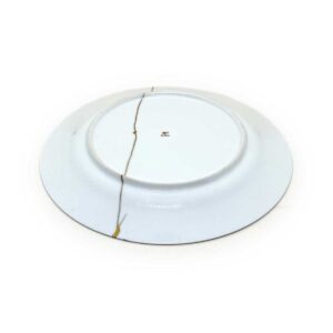 真っ二つに割れていた断面を樹脂で強固に接着し、元の形へと復元しました。 仕上げには、お皿の美しい絵柄や雰囲気を損なわないよう、あえて細いラインを描く「金筋(きんすじ)」を選択。 割れ目が目立つのではなく、まるで元々のデザインの一部であったかのように、下地の模様と調和する金蒔絵を施しました。 思い出はそのままに、新たな景色をまとって再び食卓で活躍してくれることと思います。