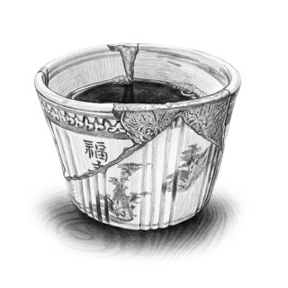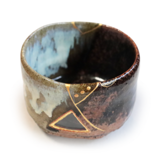 本来、金継ぎとは破損した陶磁器やガラス・漆器などを修復し復元する技術で、ひび割れた部分などの水漏れとニュウ(ヒビ)の進行を防ぎ、破片が無く欠けた部分を穴埋めしたり、さらに修復された部分を美術的な観点より金粉(消粉)を蒔くことを言います。