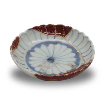 初期伊万里 染付 菊紋 塩皿 最新情報 2022.11.082026.01.21 初期伊万里 染付 菊紋 塩皿 sss01画像一覧復元修復 金継ぎ 金蒔絵初期伊万里の塩皿で破損し欠損したところを樹脂で復元させ、朱色の下地に金の蒔絵を施しています。裏面にも染付で山水が描かれていましたので、その連鎖も蒔絵で描いています。