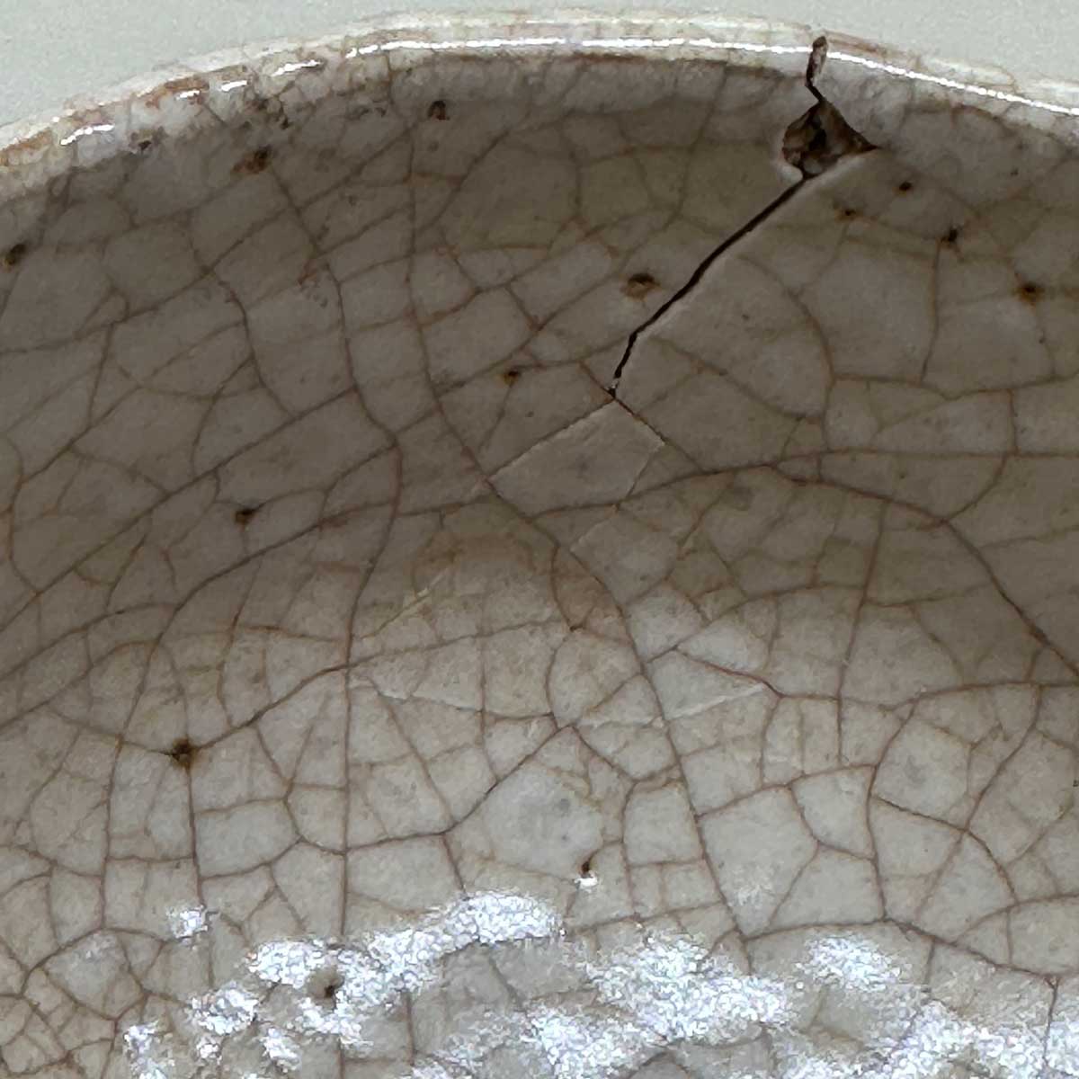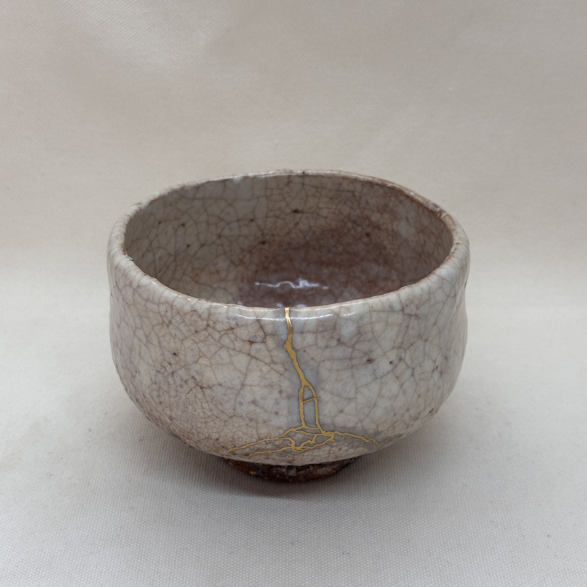 元々の器にある貫入(釉薬のヒビ)の繊細さと、金継ぎの大胆なラインの対比が素晴らしいです。器の肌合いと金の色味がお互いを引き立て合っています。
