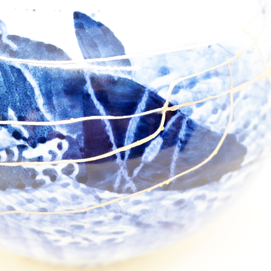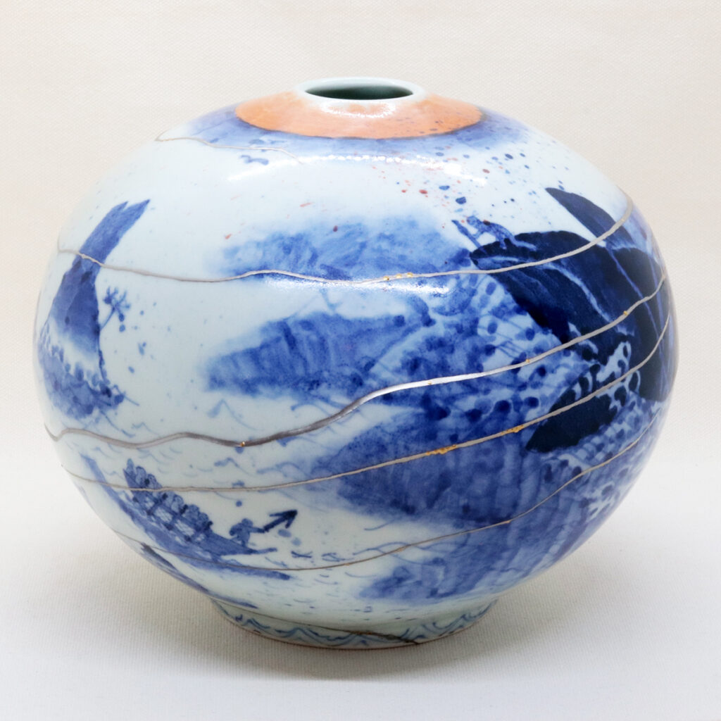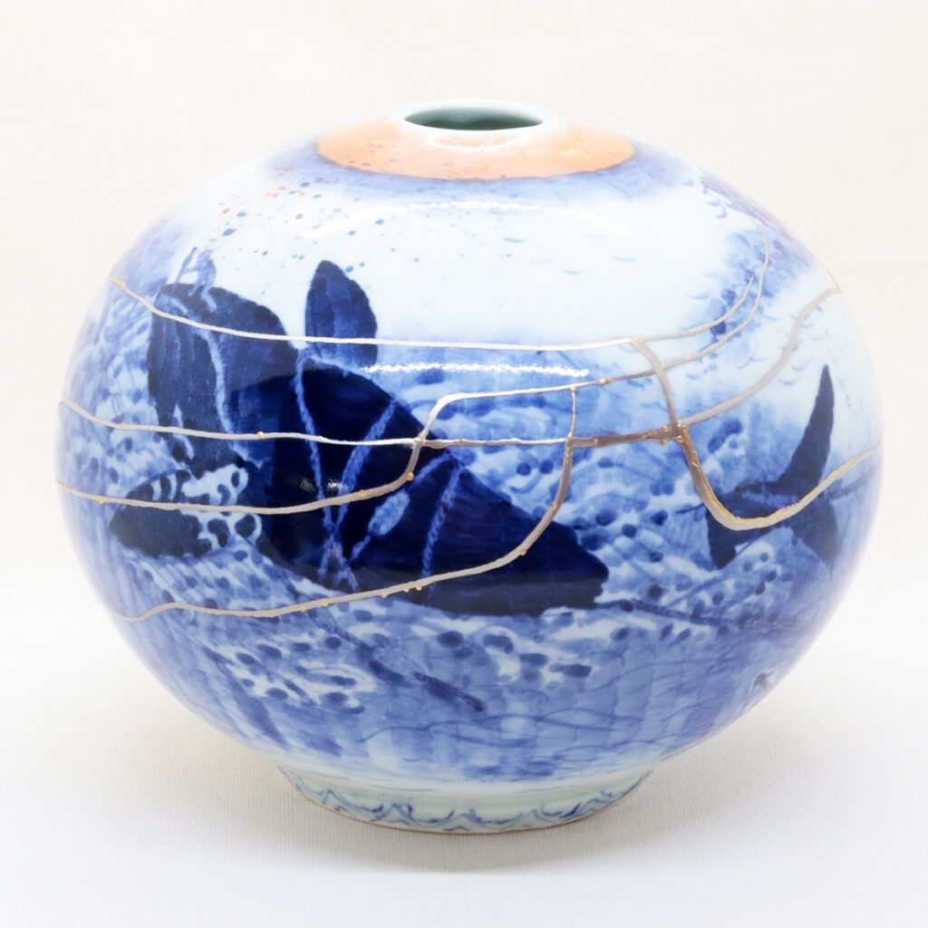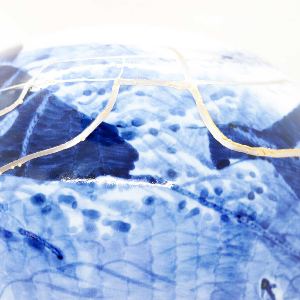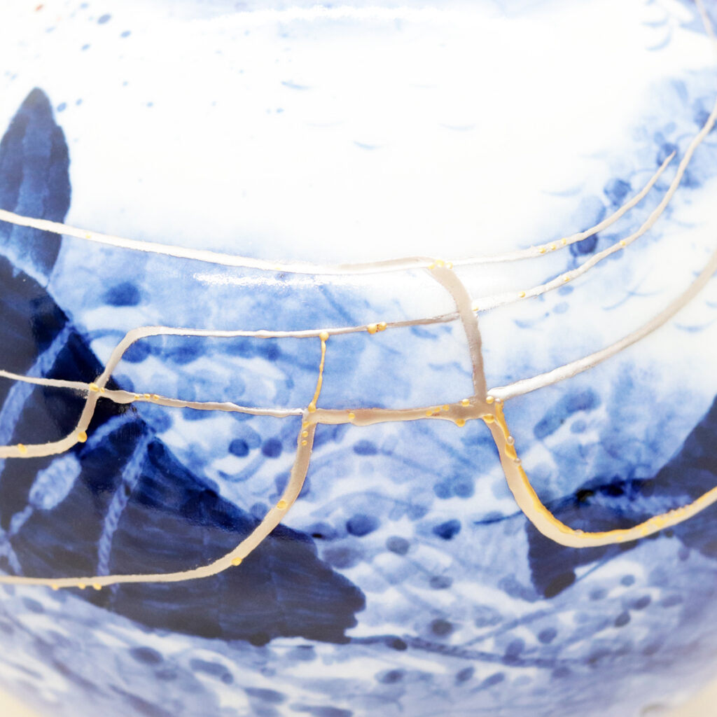 磁器丸壺20230416 金継依頼品 2023.04.162026.01.17 Before After 磁器の丸壺が渦巻き状にヒキが入り、三個に割れていました。ヒキの部分も広がっていて修復可能かどうかと尋ねられました。なんとか継いで開いた所は埋めてなんとか形にして、蒔絵はプラチナが良いという事でプラチナ蒔絵を施しました。
