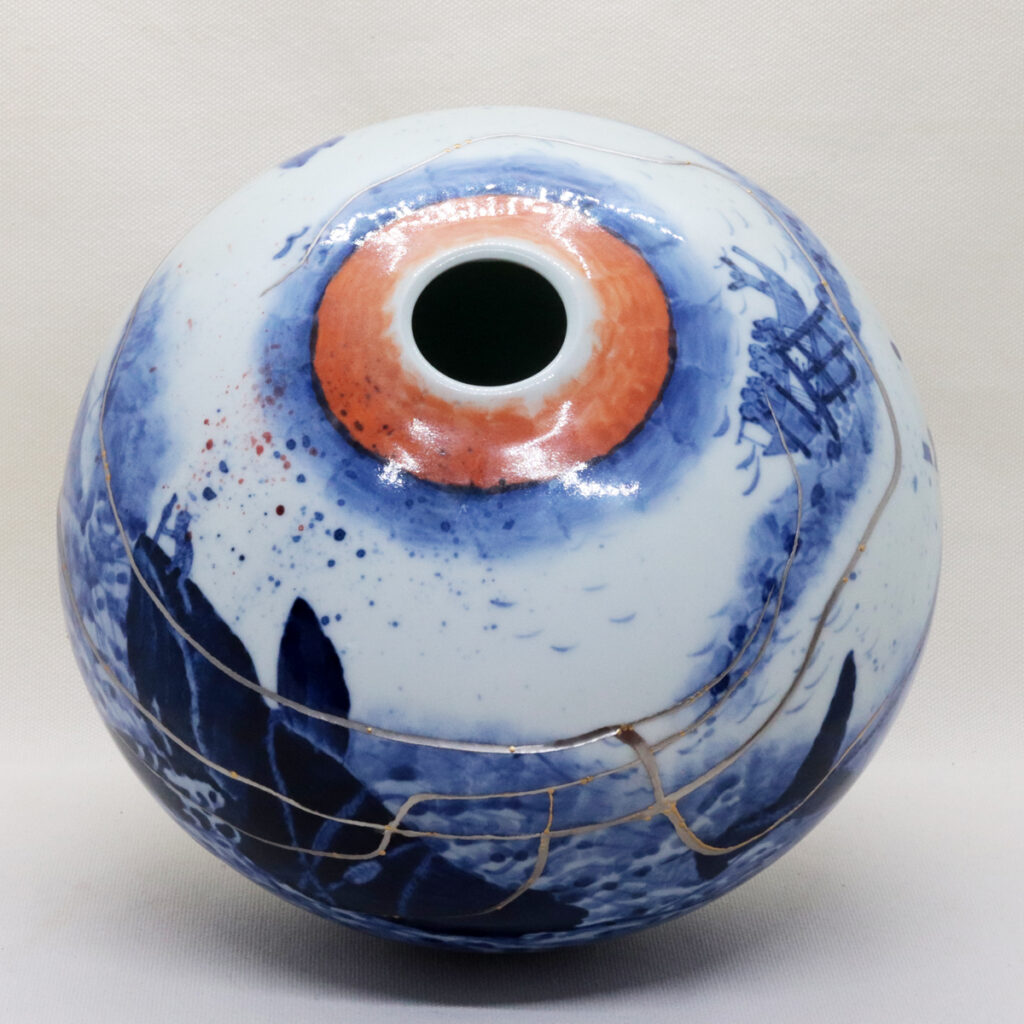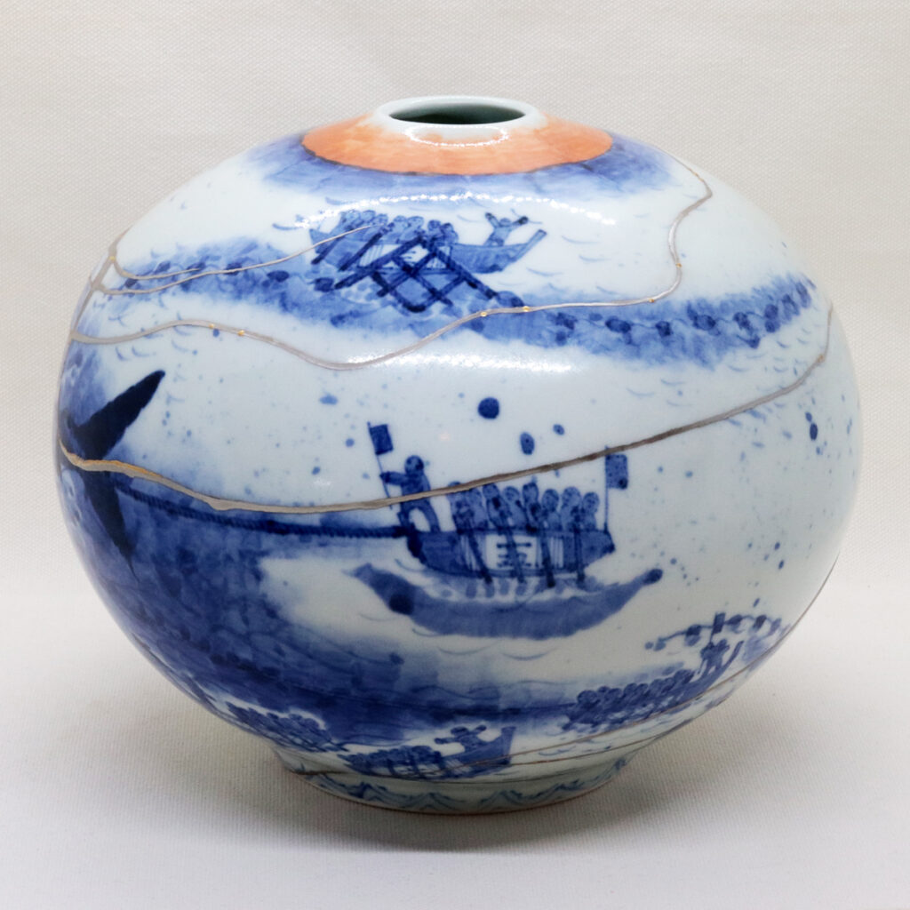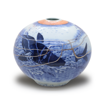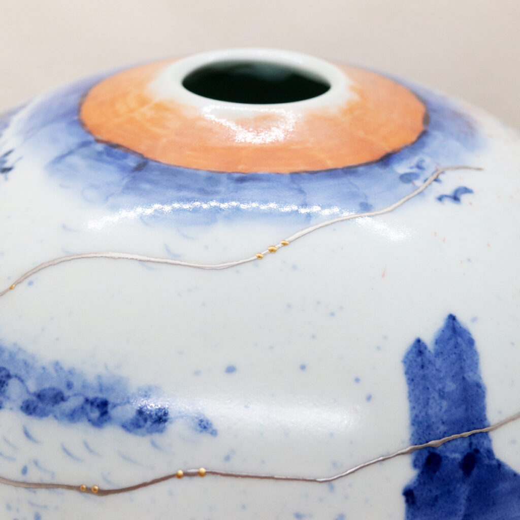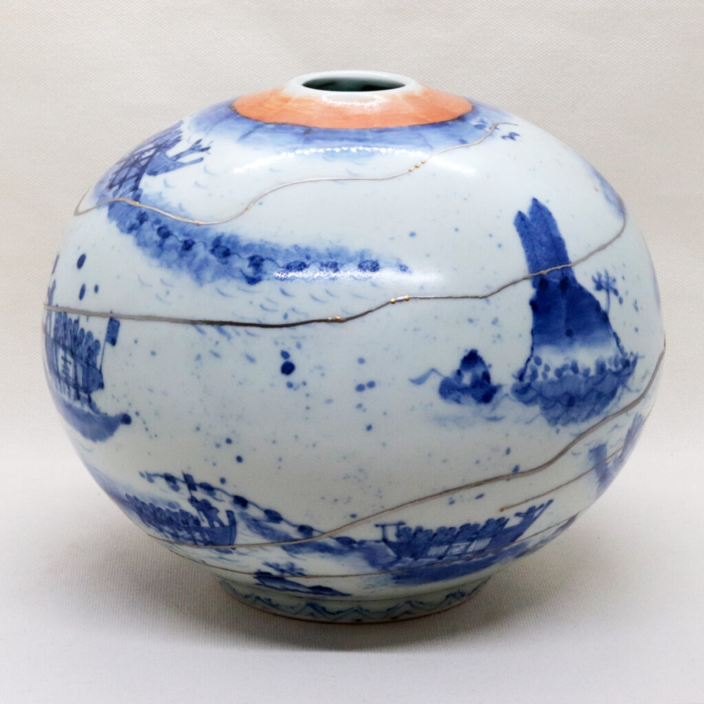 磁器丸壺20230416 金継依頼品 2023.04.162026.01.17 Before After 磁器の丸壺が渦巻き状にヒキが入り、三個に割れていました。ヒキの部分も広がっていて修復可能かどうかと尋ねられました。なんとか継いで開いた所は埋めてなんとか形にして、蒔絵はプラチナが良いという事でプラチナ蒔絵を施しました。