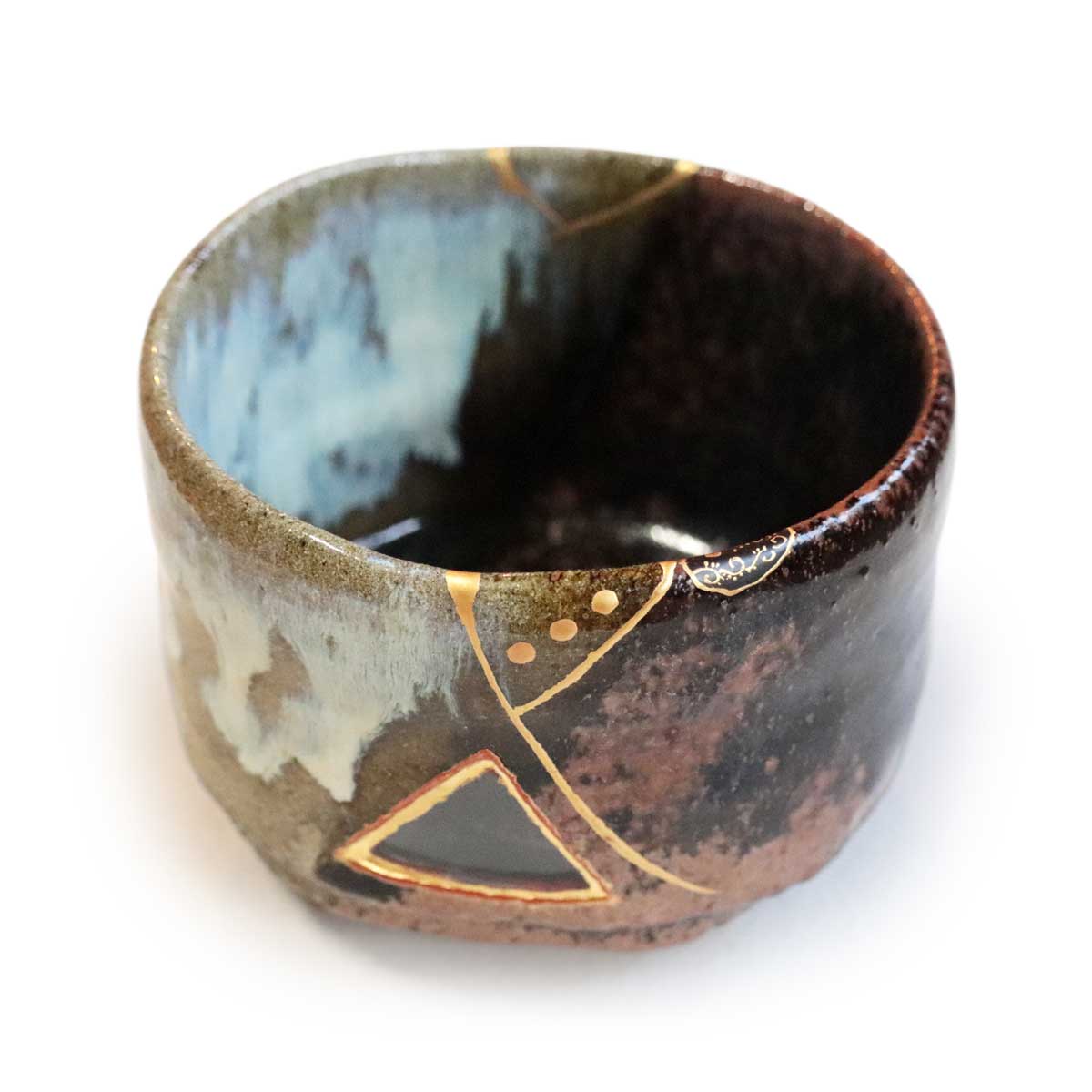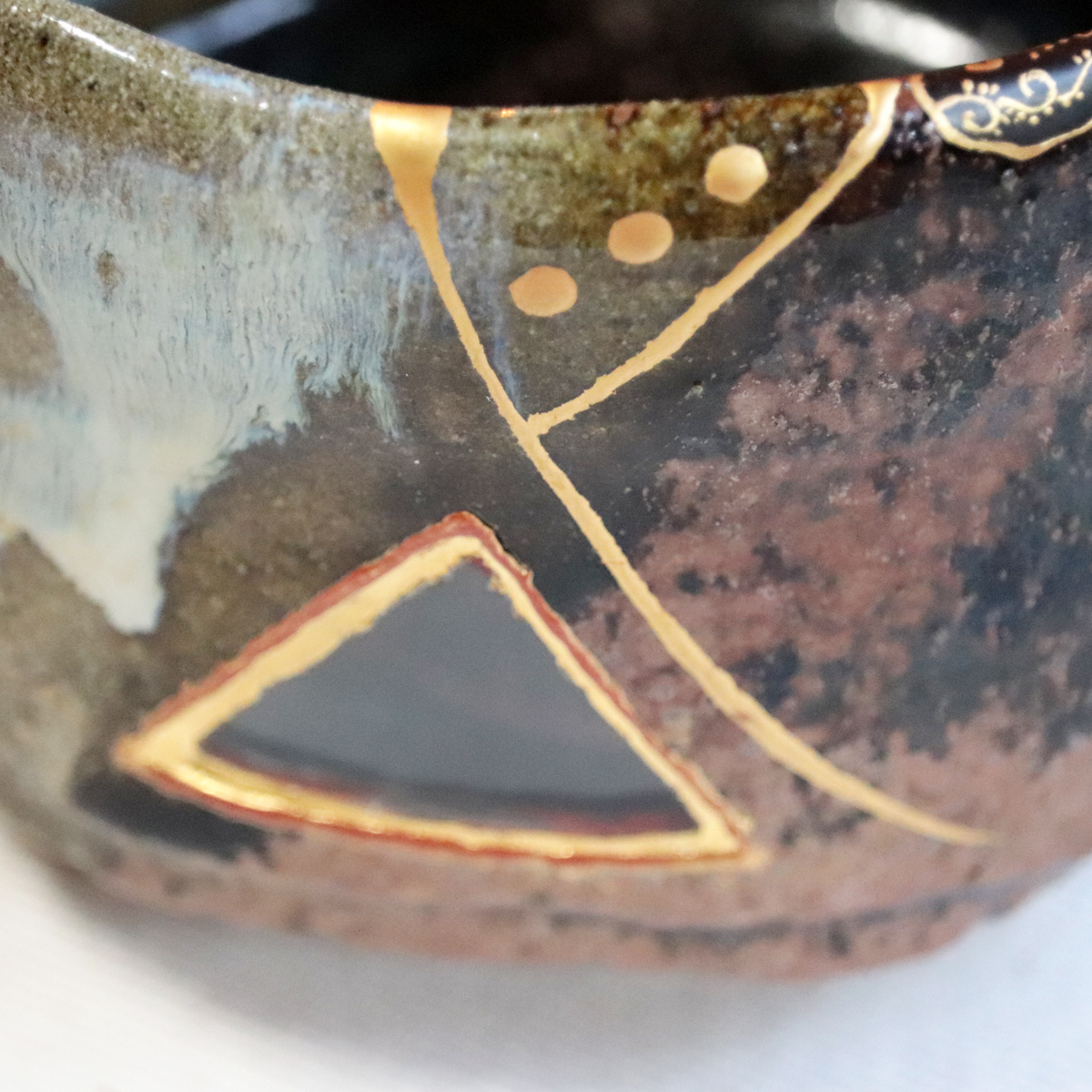 本来、割れや欠けを修復する技法である「金継ぎ」を、あえて創作的な表現として昇華させました。 朝鮮唐津の渋い色合いの中に、クリアなガラスの透明感が加わることで、非常にモダンな印象を与えています。