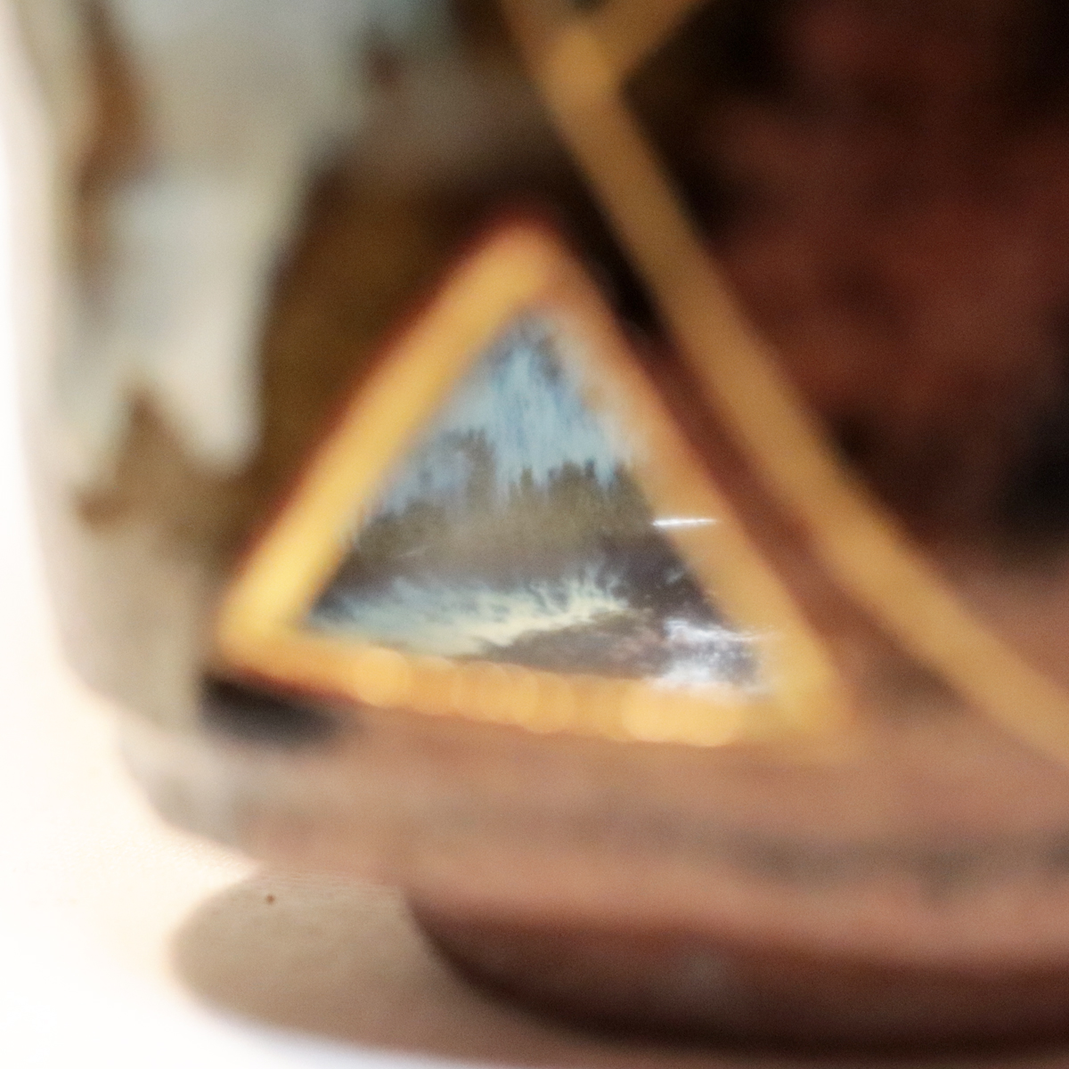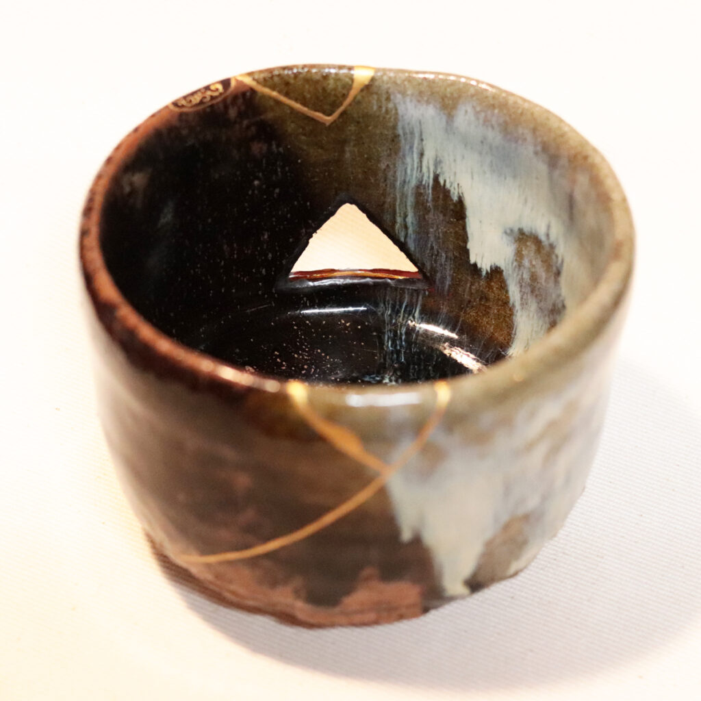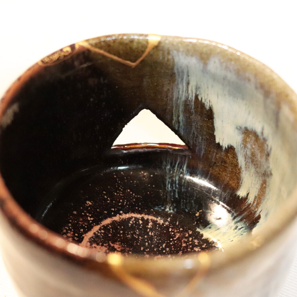 この作品の最大の特長は、器の一部に埋め込まれた三角形のガラスです。