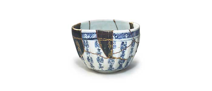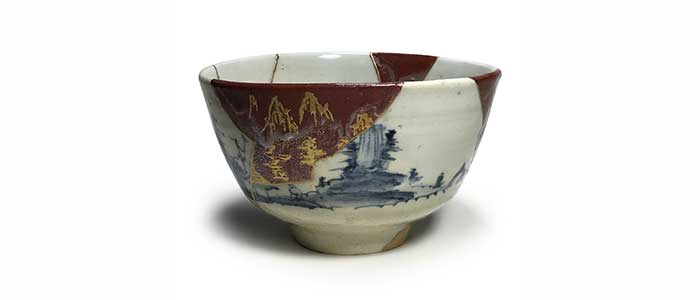 Originally, kintsugi refers to the technique of repairing and restoring damaged ceramics, glass, lacquerware, and similar objects. It prevents water leakage and the progression of cracks in fractured areas, fills gaps where fragments are missing, and further involves sprinkling gold powder (shippo) over the repaired sections from an artistic perspective.
