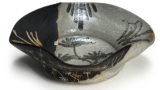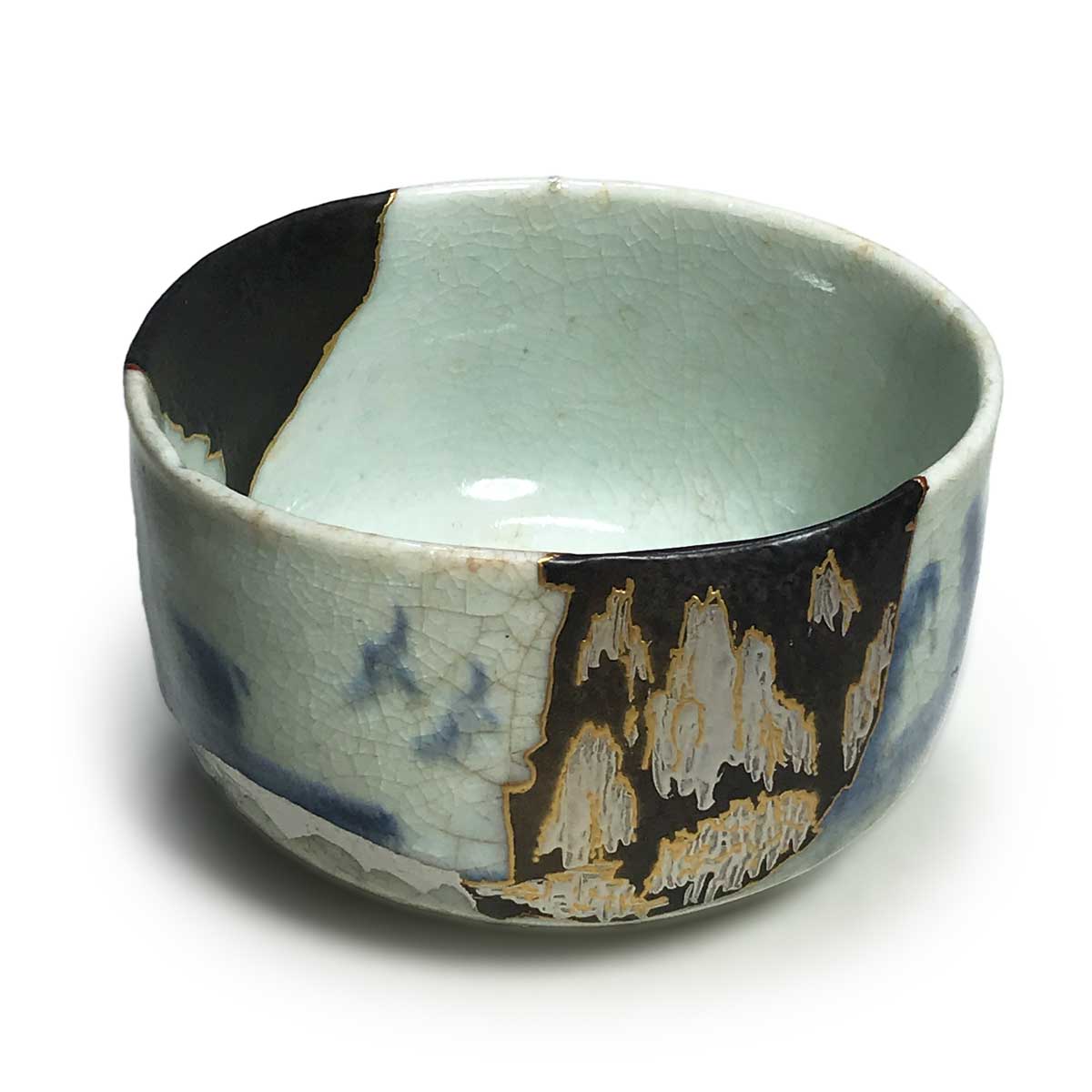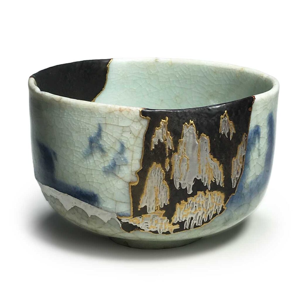The missing section was reinforced with resin, filled with black resin, and then decorated with gold and silver maki-e depicting a landscape similar to the original ceramic fragments. This restoration has created a unique tsubo-shaped form characteristic of kotsugi, resulting in a beautiful aesthetic that transcends simple reconstruction.