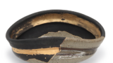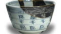 This early Imari tea bowl features a landscape design and has a tsubo-shaped form. Originally a perfectly round vessel, it suffered a large break primarily at the foot. Two similar ceramic fragments were carefully joined using the “kotsugi” (joined repair) technique.