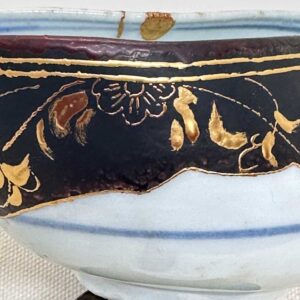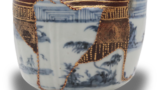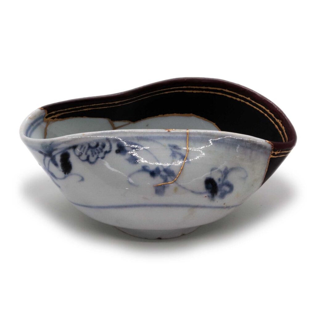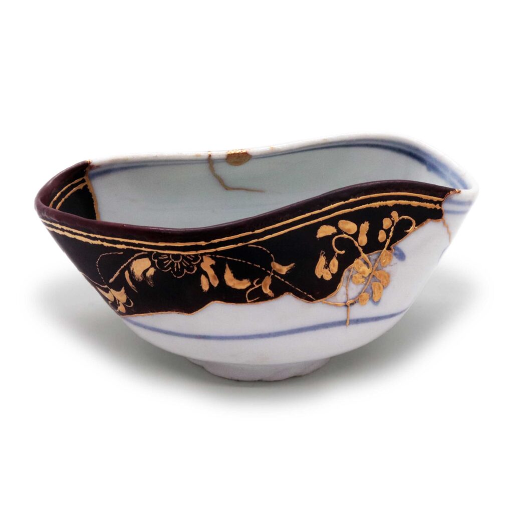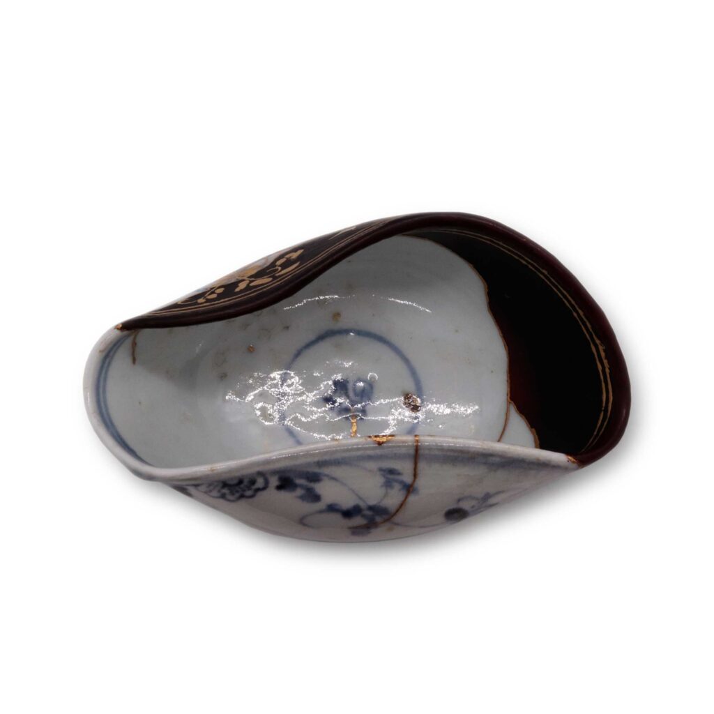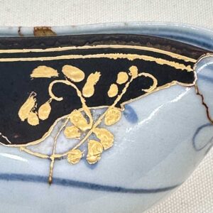 Techniques: Blue-and-white underglaze decoration, kintsugi (gold-joined repair), resin restoration, maki-e (lacquer decoration)