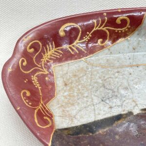 Contrast of Iron Sand and Vermilion: The original sections feature a rustic charm, with the iron sand glaze creating a tea-brown hue and the white porcelain body showcasing a beautiful layered effect. In contrast, the restored section boasts a glossy vermilion base adorned with delicate gold and silver maki-e. This bold contrast between “wabi” (austere simplicity) and “splendor” creates a new visual landscape for the vessel.