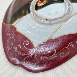 【Background】 This piece is based on an early Edo period “Early Imari” flat muko-zuke. Approximately one-quarter of the original vessel was significantly damaged, but the lost section was boldly restored using resin. By applying gold and silver maki-e over a vivid vermilion base, the unique original “triangular” form has been revived for the modern era.