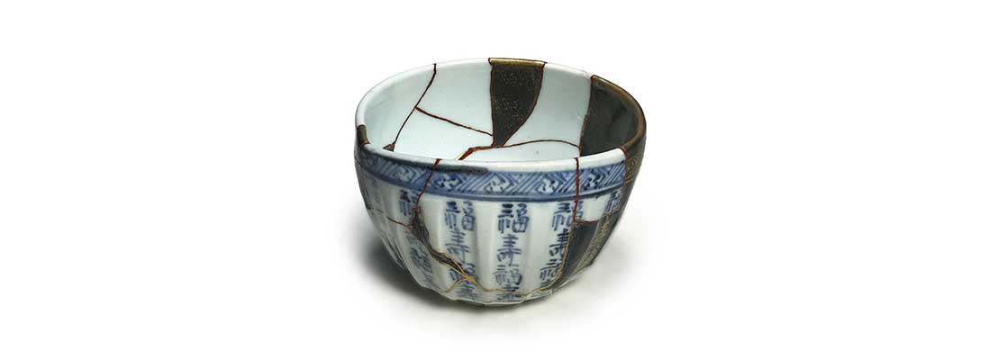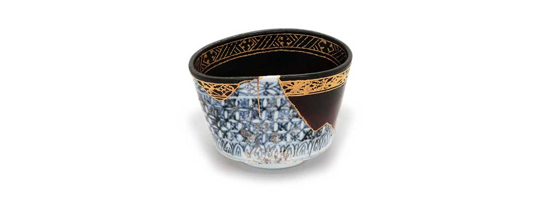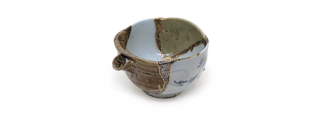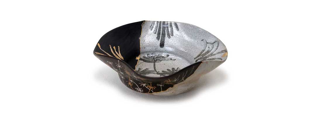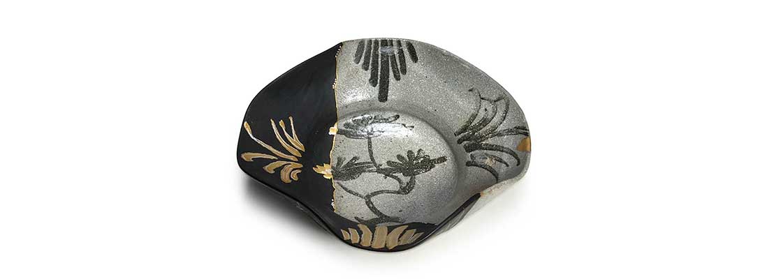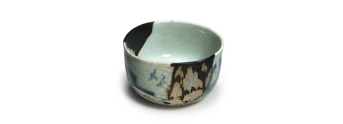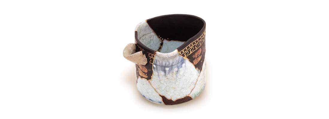 初期伊万里の筒茶碗を母体に、古唐津の片口の意匠を融合させ、さらに伝統技法「金継ぎ」によって再生させた作品です。初期伊万里特有の白磁に呉須流しを帯びた釉調と、古唐津片口の素朴な造形美がひとつの器に共鳴しています。欠けや割れを補う金継ぎは単なる修復にとどまらず、器そのものに新たな景色を生み出し、唯一無二の表情を与えています。