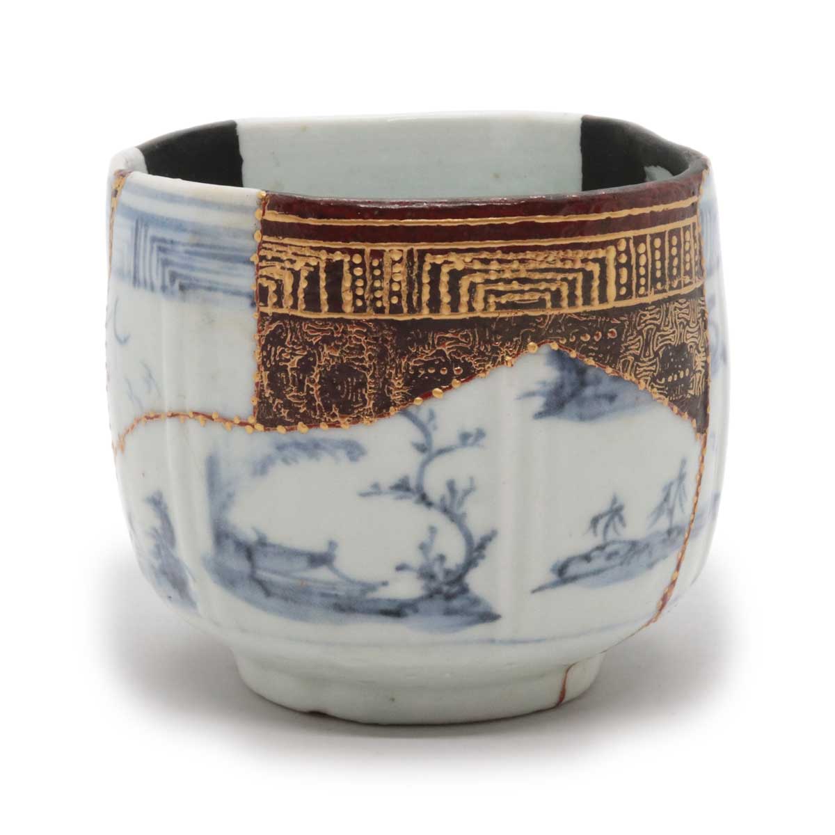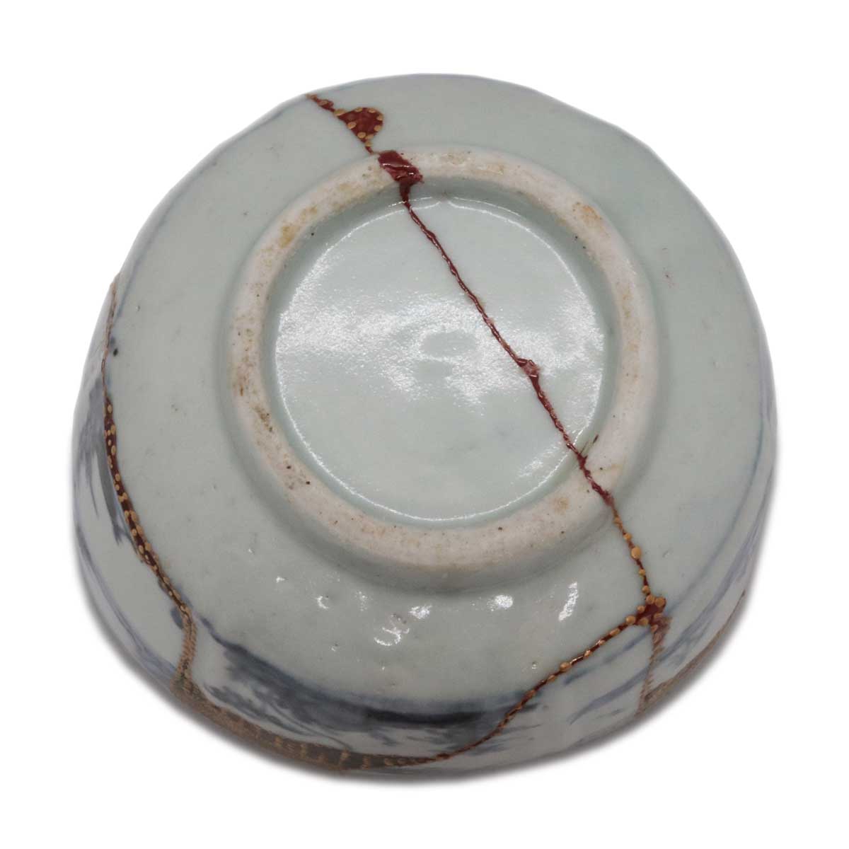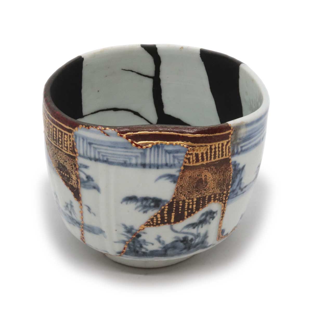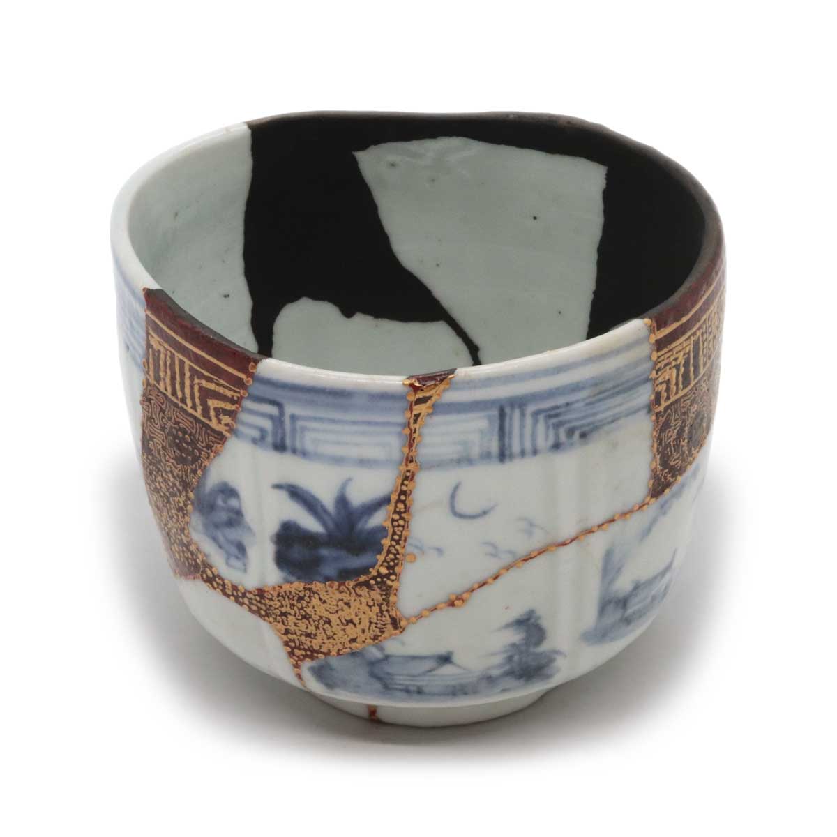 初期伊万里の陶片を幾重にも継ぎ合わせ、さらに呼継ぎの技法を用いて他の陶片を融合させ、欠損部分を樹脂で補い、金継ぎにより新たな命を吹き込んだ茶碗です。