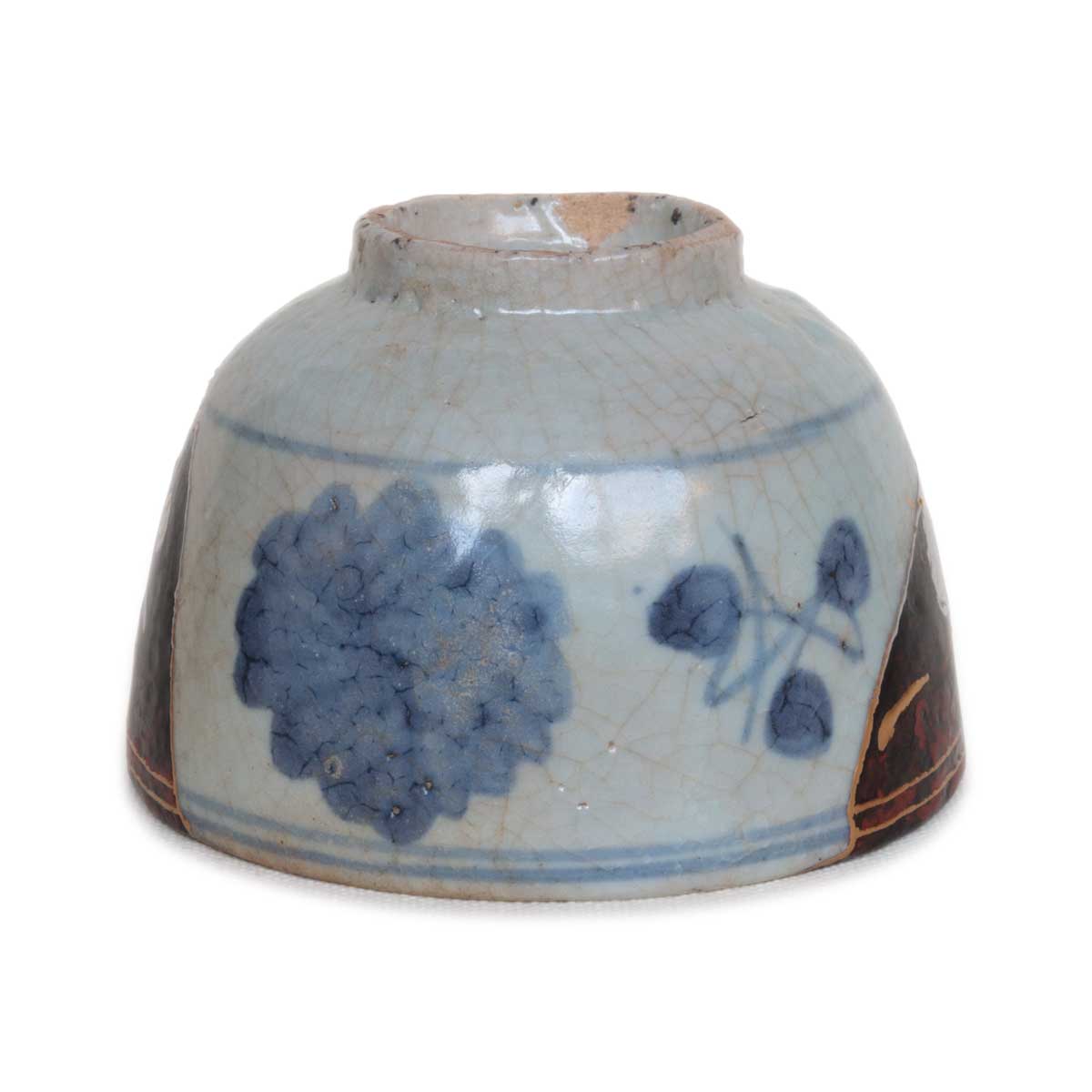 欠けた部分には、割れる前に存在したであろう文様を忠実に描き入れ、木葉実の紋様が器全体に咲き広がる姿を再現いたしました。かつての美しい佇まいを想像しながら蘇らせたその姿は、単なる修復にとどまらず、過去の時間を今に映し出し蘇らせています。