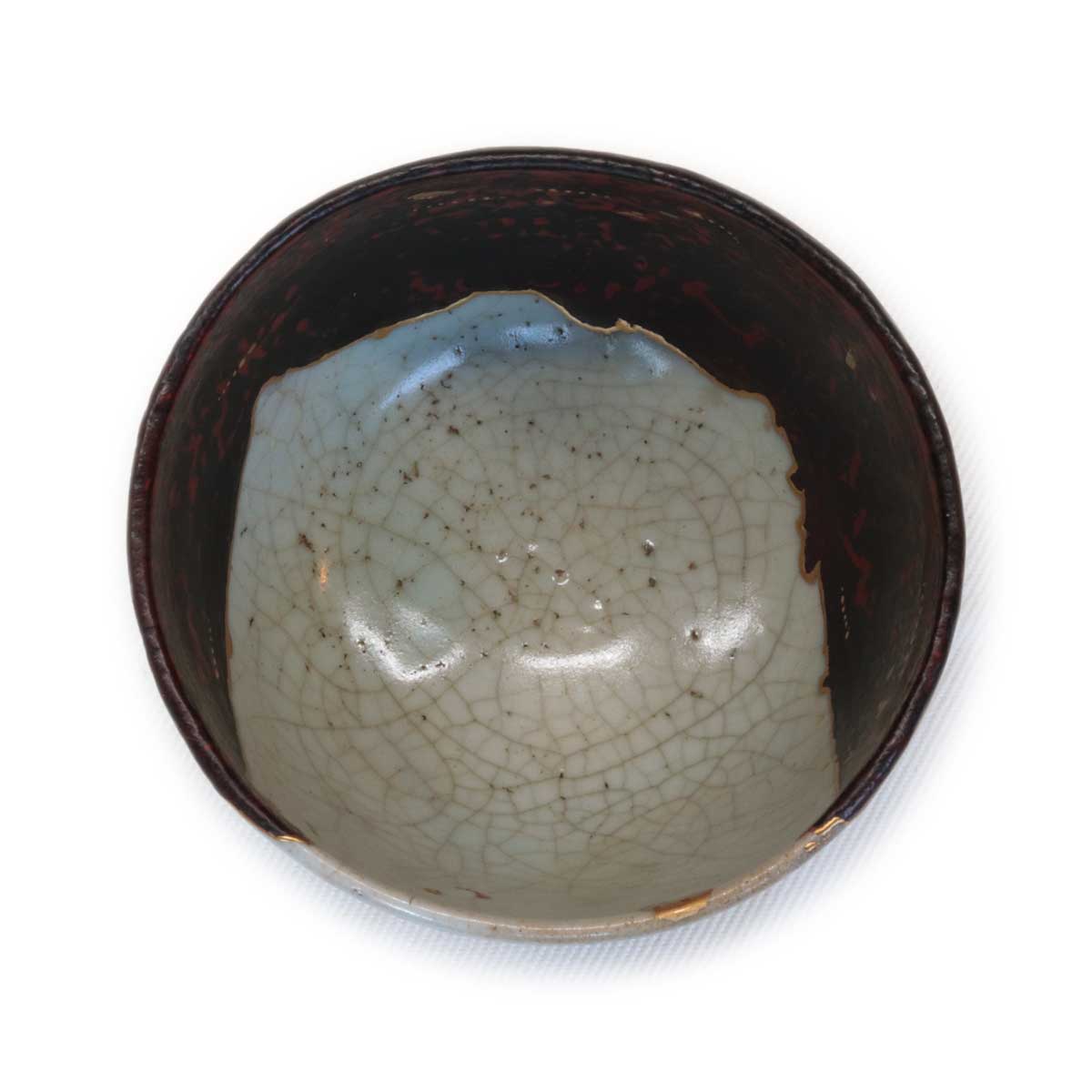 本作は、口縁部のわずか四分の一のみが残された初期伊万里の陶片をもとに、樹脂で形を復元し、さらに金と銀の蒔絵をほどこして仕上げた茶碗です。