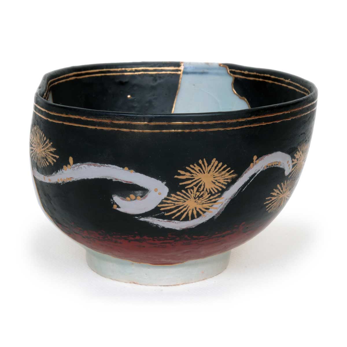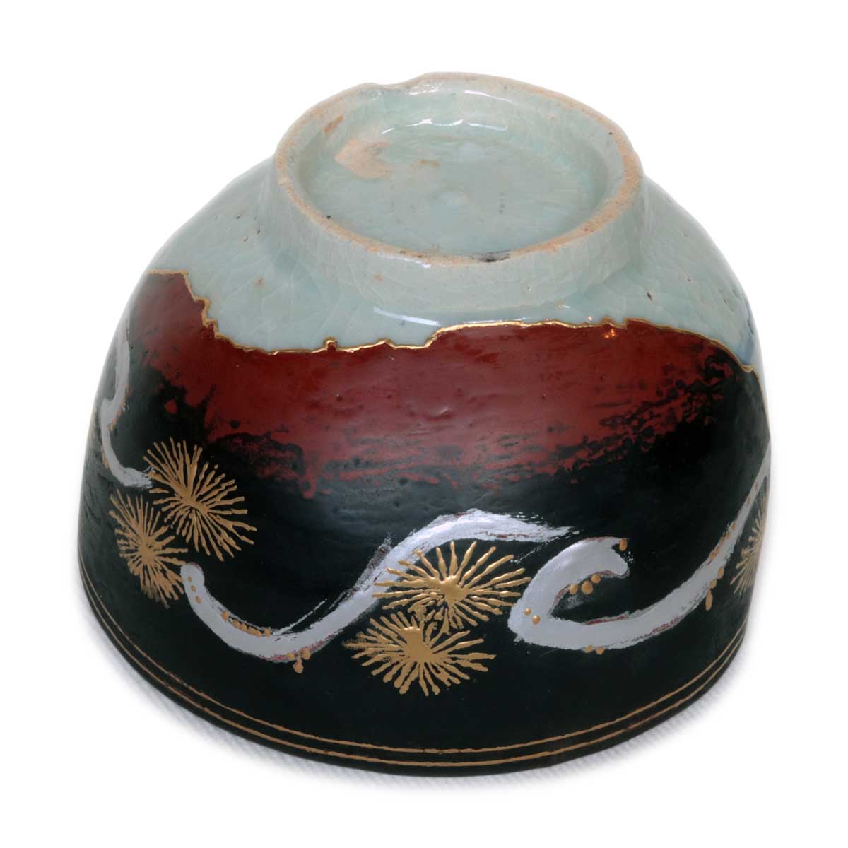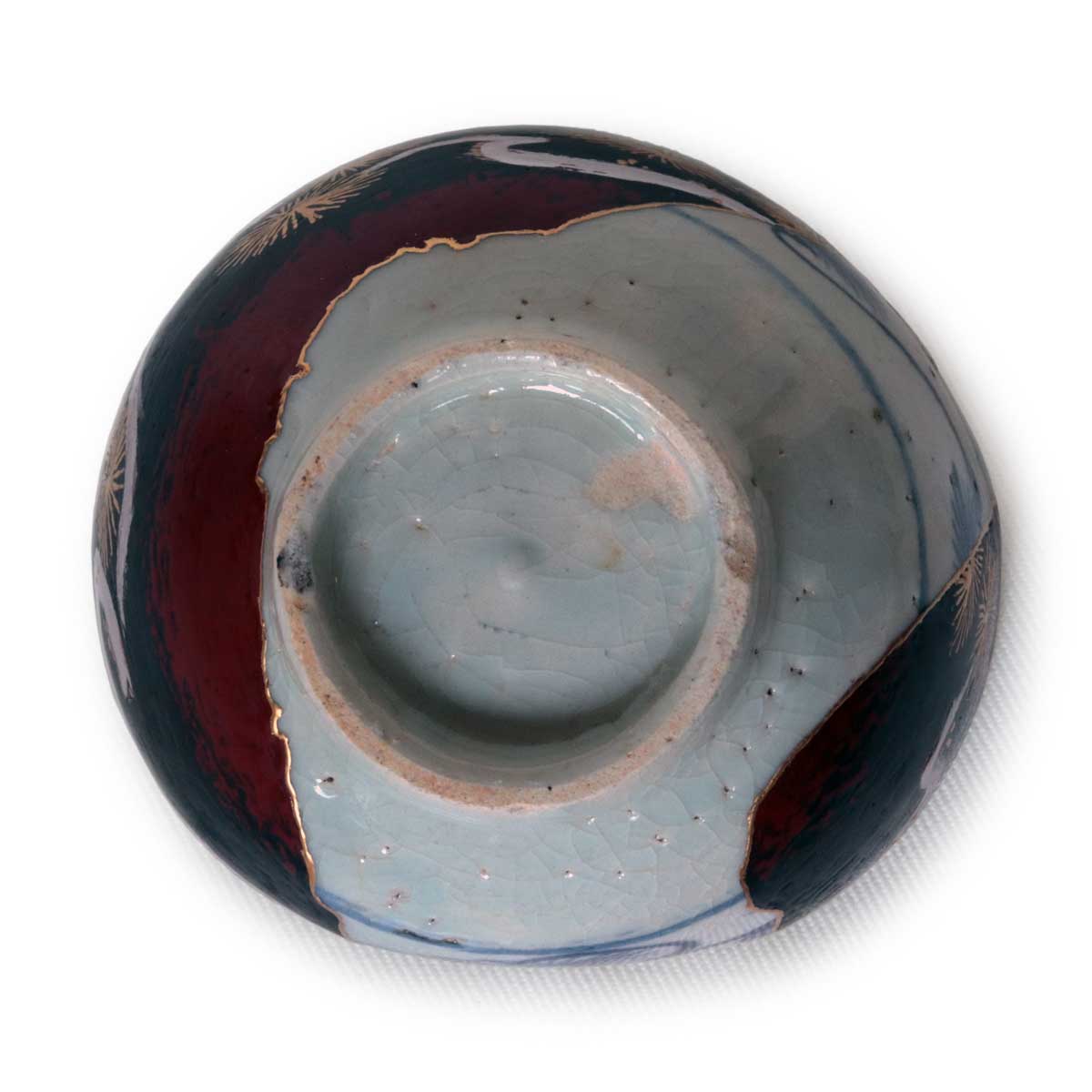 見込みには、椿か牡丹と見られる花文が描かれており、そのわずかに残された意匠を生かすために復元を試みた作品です。胴まわりには松の連鎖模様が施されていた痕跡が見られたため、欠損部分には黒と赤のグラデーションで下地を作り、そこへ金銀の蒔絵を重ねて松の連鎖を表現しました。