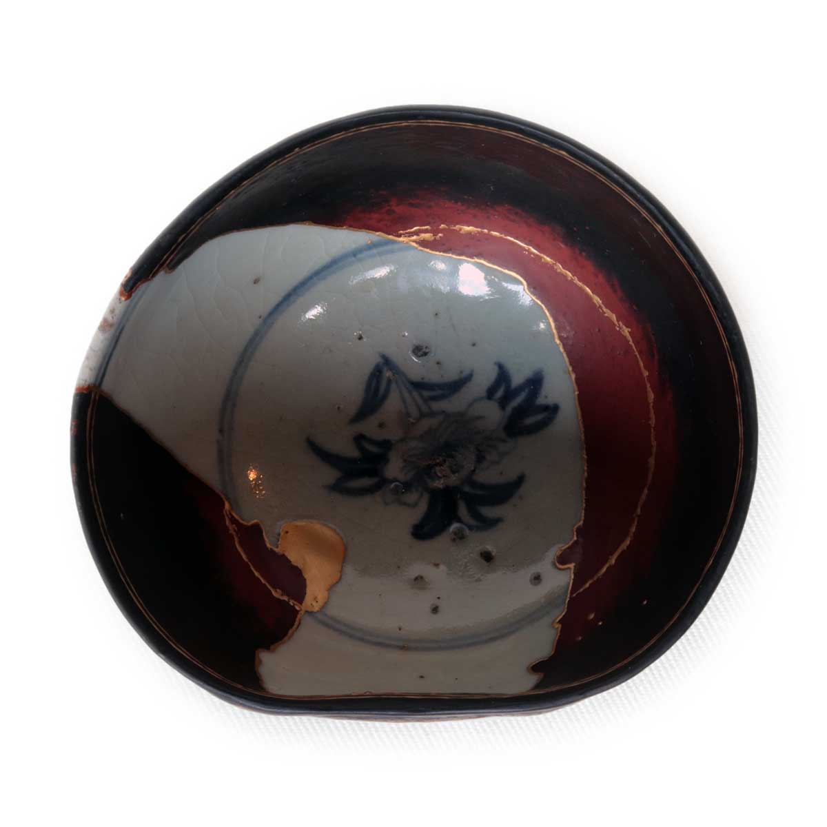 青磁がかった釉薬には貫入が入り、やや低火度で焼かれた柔らかな質感が、初期伊万里ならではの素朴かつ幽玄な趣を漂わせています。欠損を補い、金銀の輝きを纏って蘇ったこの茶碗は、単なる器を超え、時代の美意識と再生の物語を映す一碗といえるでしょう。
