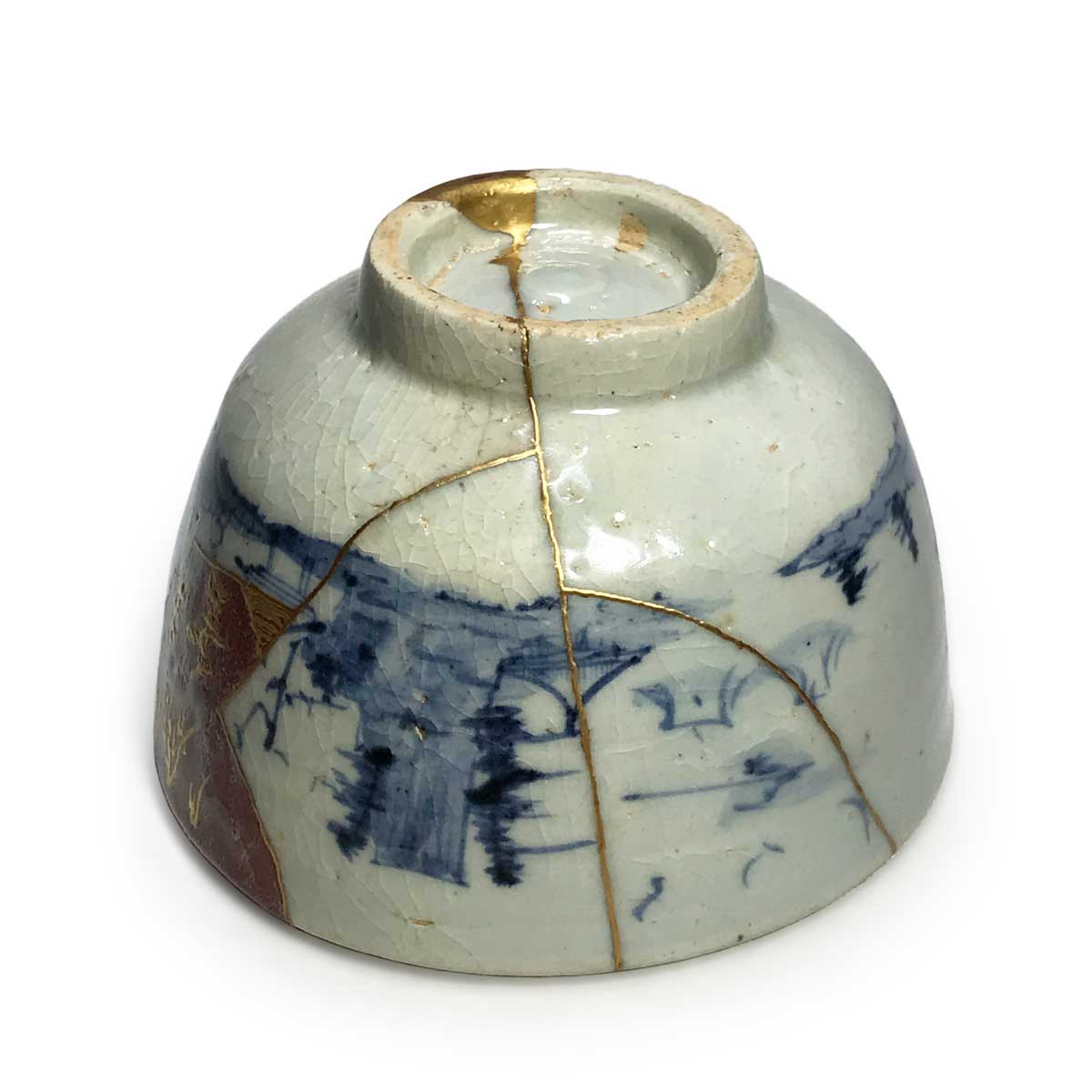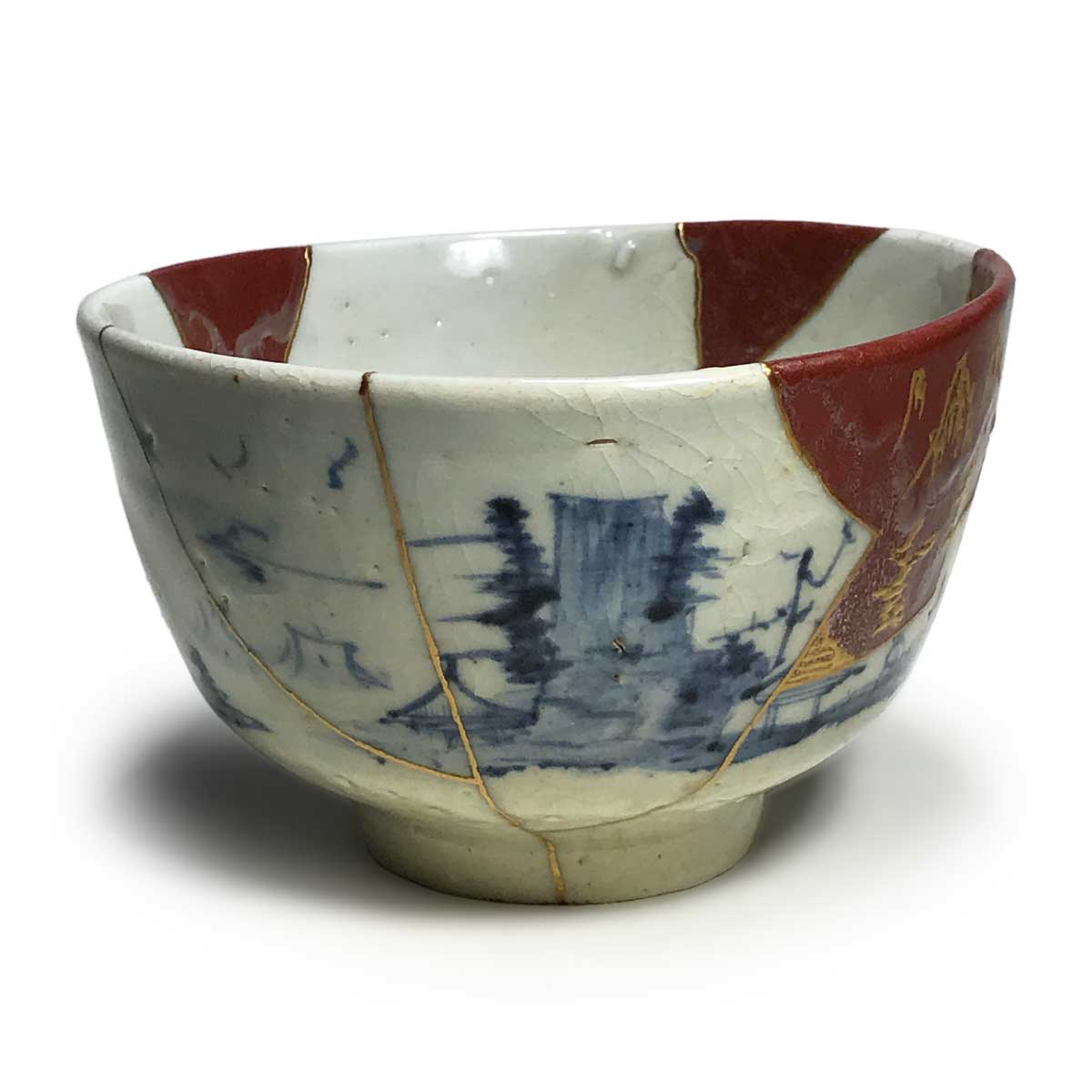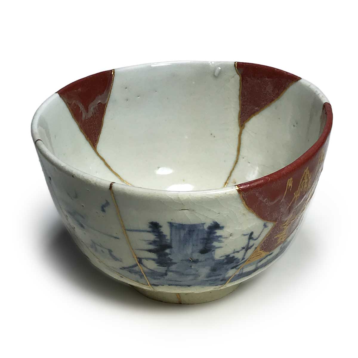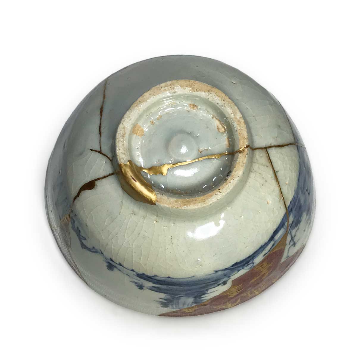 時を超え、数百年の歴史を紡いできた初期伊万里の山水紋茶碗。かつては欠けや破損によりその姿を失いかけた陶片も、匠の手によって丁寧に共継ぎ修復されました。欠損部分は樹脂で補い、朱色の弁柄を混ぜた樹脂で美しく復元。さらに金銀蒔絵で山水模様を繋ぐように施し、欠けた部分が新たな美として輝きを放つ「金継ぎ」の技法が、この茶碗に命を吹き込んでいます。
