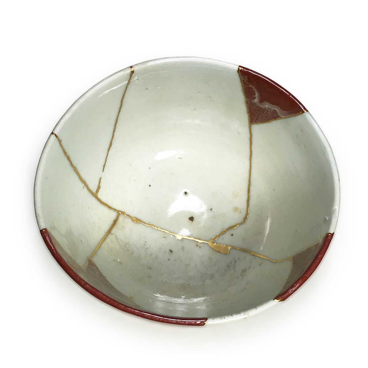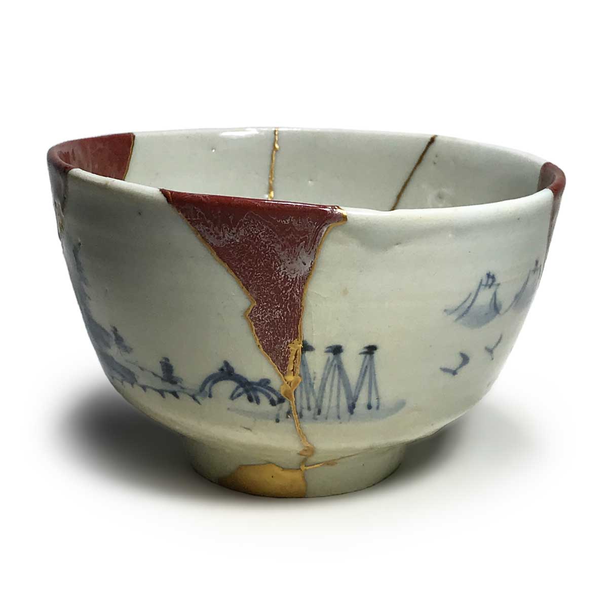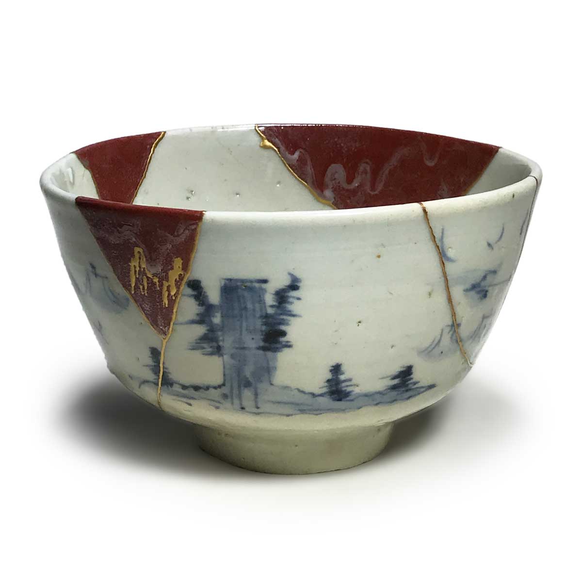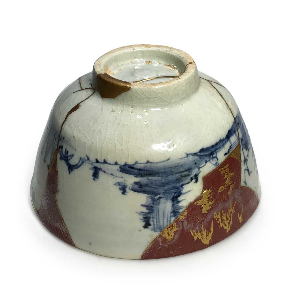 時を超え、数百年の歴史を紡いできた初期伊万里の山水紋茶碗。かつては欠けや破損によりその姿を失いかけた陶片も、匠の手によって丁寧に共継ぎ修復されました。欠損部分は樹脂で補い、朱色の弁柄を混ぜた樹脂で美しく復元。さらに金銀蒔絵で山水模様を繋ぐように施し、欠けた部分が新たな美として輝きを放つ「金継ぎ」の技法が、この茶碗に命を吹き込んでいます。