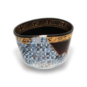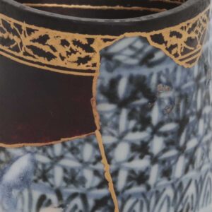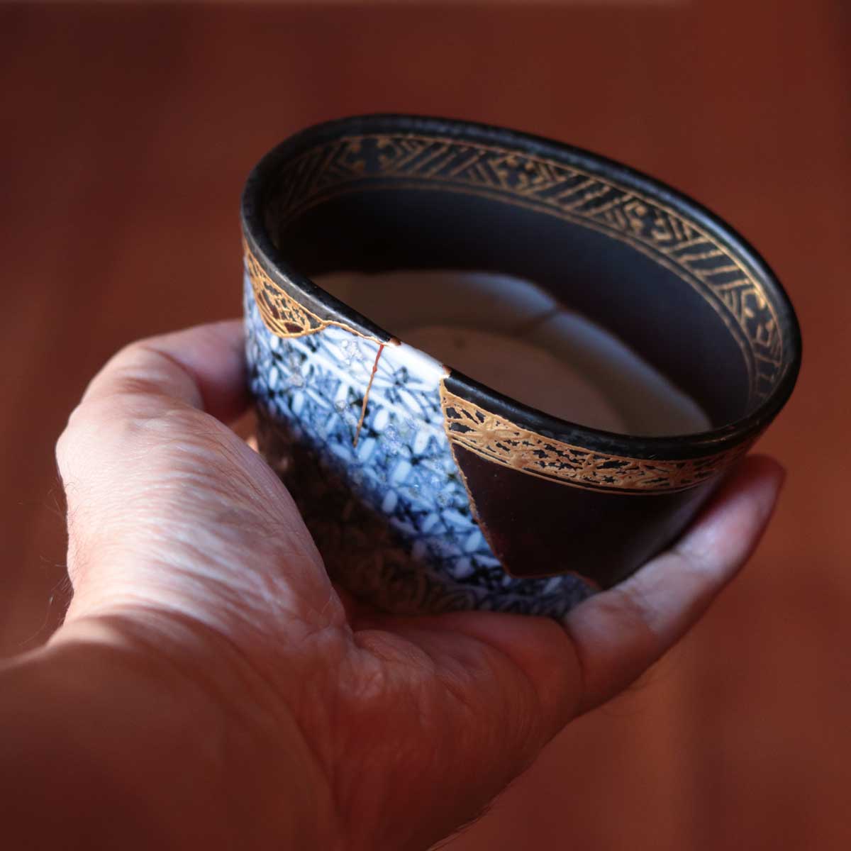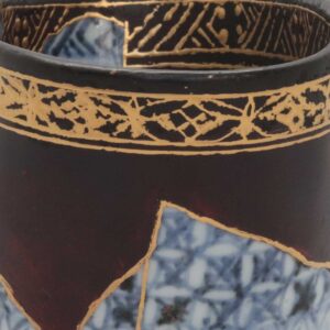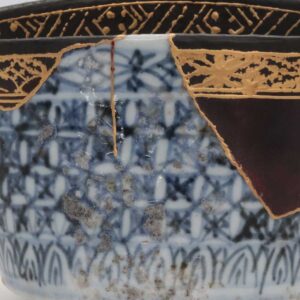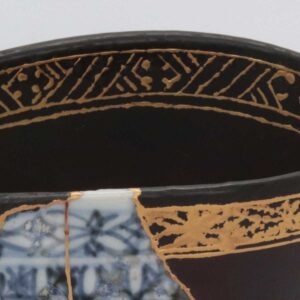 オリジナルの染付による精緻な祥瑞紋の「青」と、大きく欠損した部分を補う漆黒の「黒」。この二つの世界を、金継ぎのラインと、縁(口縁)に施された金蒔絵の文様が繋ぎ合わせています。修復部分にあえて元の文様を金で描き写すことで、片身替わりのようなモダンな景色(デザイン)へと昇華されています。
