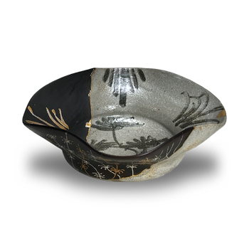 【作品の背景と技法】 本作品の基となっているのは、古唐津の絵唐津四方向付の陶片です。本来の形状の約四割が欠損している状態でしたが、その失われた部分を樹脂を用いて慎重に繋ぎ合わせ、元の形状と厚みを忠実に復元しました。