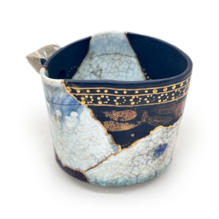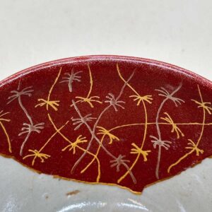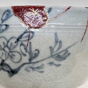 欠損を単に金で覆うのではなく、朱や黒で下地を整えた上で金銀の蒔絵を重ねることで、修復の痕跡が一層引き立ち、茶碗全体に新たな景色が生まれています。