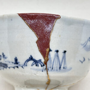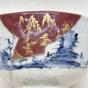 時を超え、数百年の歴史を紡いできた初期伊万里の山水紋茶碗。かつては欠けや破損によりその姿を失いかけた陶片も、匠の手によって丁寧に共継ぎ修復されました。欠損部分は樹脂で補い、朱色の弁柄を混ぜた樹脂で美しく復元。さらに金銀蒔絵で山水模様を繋ぐように施し、欠けた部分が新たな美として輝きを放つ「金継ぎ」の技法が、この茶碗に命を吹き込んでいます。