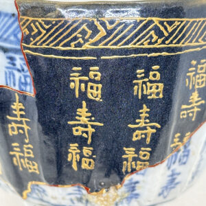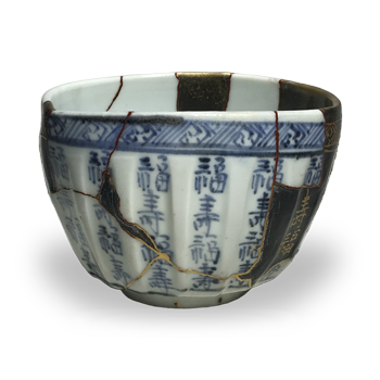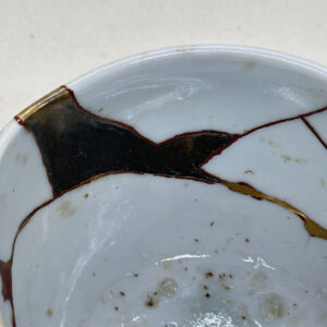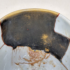 初期伊万里の福寿字紋鎬茶碗を、呼継ぎと金継、金銀蒔絵で丁寧に復元した一品です。割れた茶碗二個の部品を繋ぎ合わせ、欠けていた部分は樹脂で埋め込み、元の形からは離れたものの独特の沓形として蘇らせました。手のひらに収まるサイズ感で、日常に取り入れやすい仕上がりです。