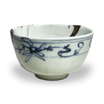 初期伊万里唐草紋碗形茶碗。高台が残り大きく割れ欠けた陶片を母体として同じ絵柄や同じ形状の陶片を呼継ぎし金継で修復されてあります。陶片が無く大きく欠けた部分には樹脂で埋められレジンで塗り修復されその上に金の蒔絵が施されています。