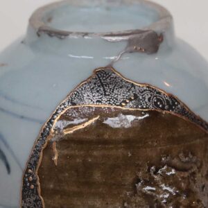 特筆すべきは、異なる陶片をつなぐ「金継ぎ」の表現です。単に欠けを補うだけでなく、継ぎ目に繊細な文様を描き込むことで、器に新たなリズムと装飾性を与えています。