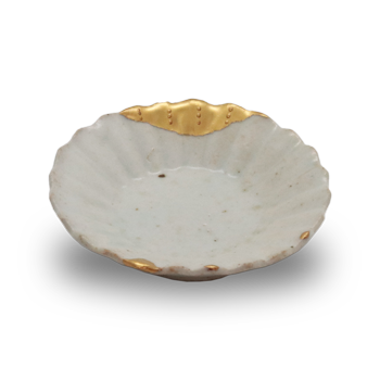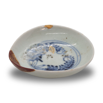 修復 金継ぎ初期伊万里の紅皿で口縁部分の欠けとメカケを金修復されています。
