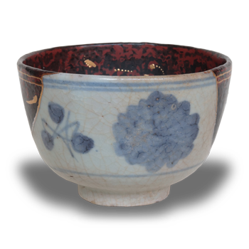 寸法:長径約12.2cm×短径約11.3cm 高さ約7.3cm重さ:約242g修復:復元修復 金継ぎ・金銀蒔絵見込みには、椿か牡丹と見られる花文が描かれており、そのわずかに残された意匠を生かすために復...