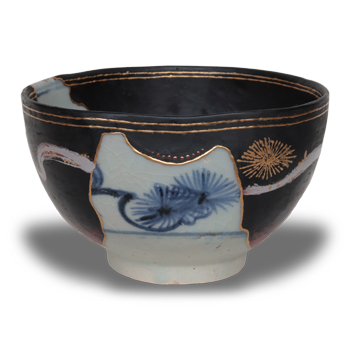 寸法:長径約10.0cm×短径約9.0cm 高さ約8.3cm重さ:約269g修復:呼継ぎ 復旧修復 金継 金蒔絵初期伊万里の陶片を幾重にも継ぎ合わせ、さらに呼継ぎの技法を用いて他の陶片を融合させ、欠損...